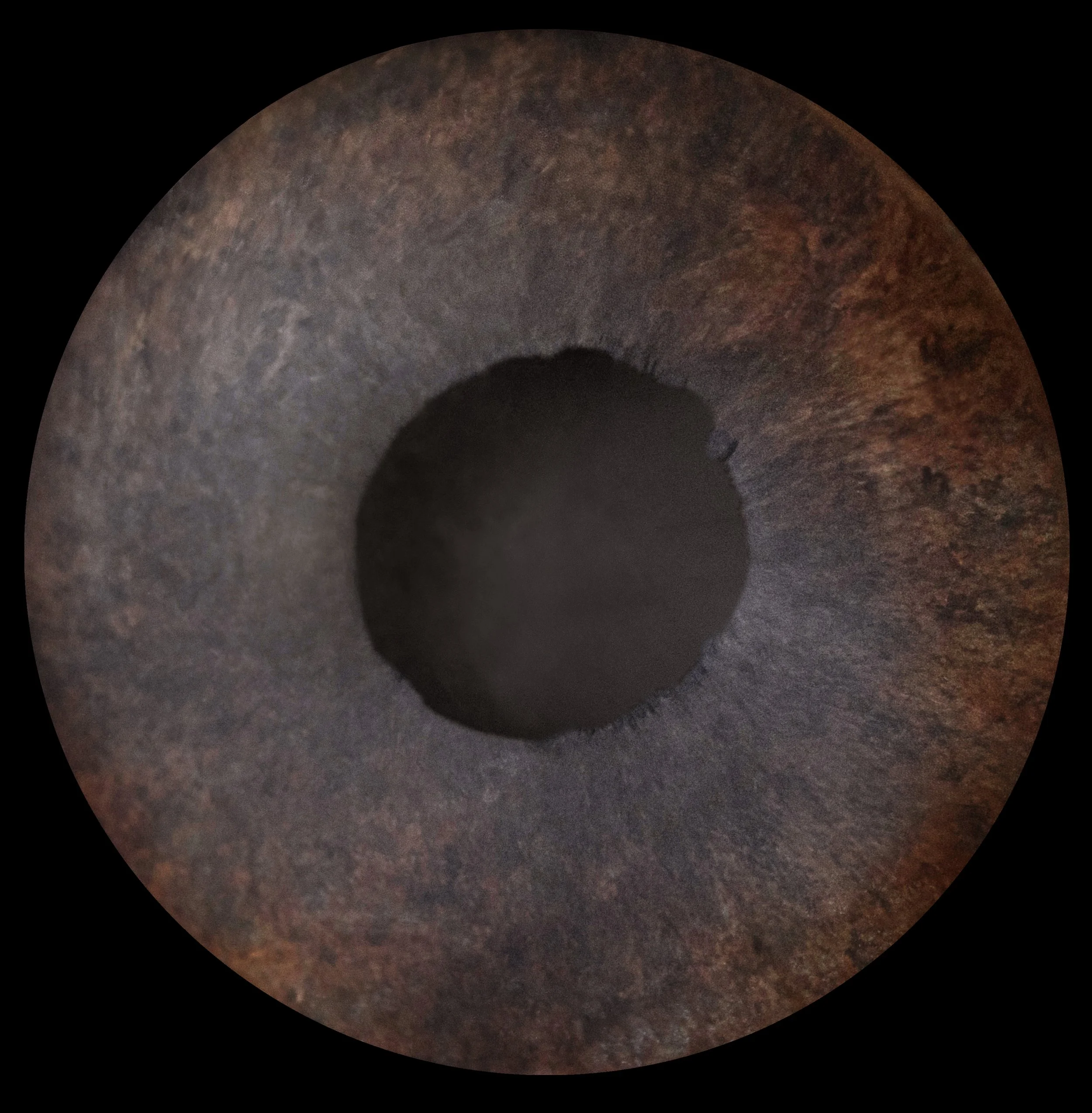A close-up photograph of Becka’s dogs iris. you can see the colouration of the iris and the pupil in the middle of the eye. Photo courtesy of Iris Galerie Jersey.