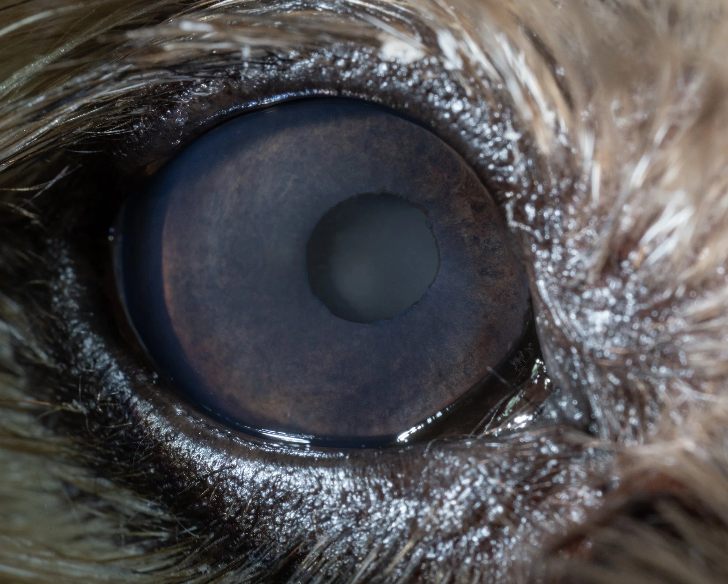 The eyes are specialised sensory organs; they contain several sophisticated structures which work together and function to provide animals with the sense of sight. Dogs have a large cornea and lens; the cornea acts as a window, controlling the entry of light into the eye and directing it towards the lens, which focuses light onto the retina, allowing dogs to see in lower light levels.