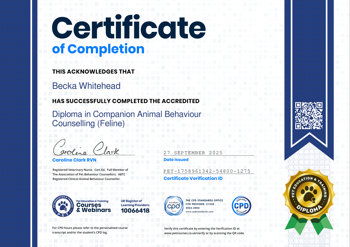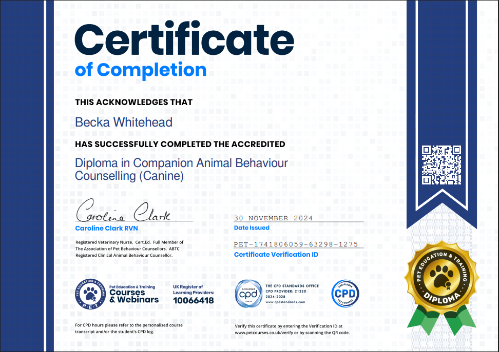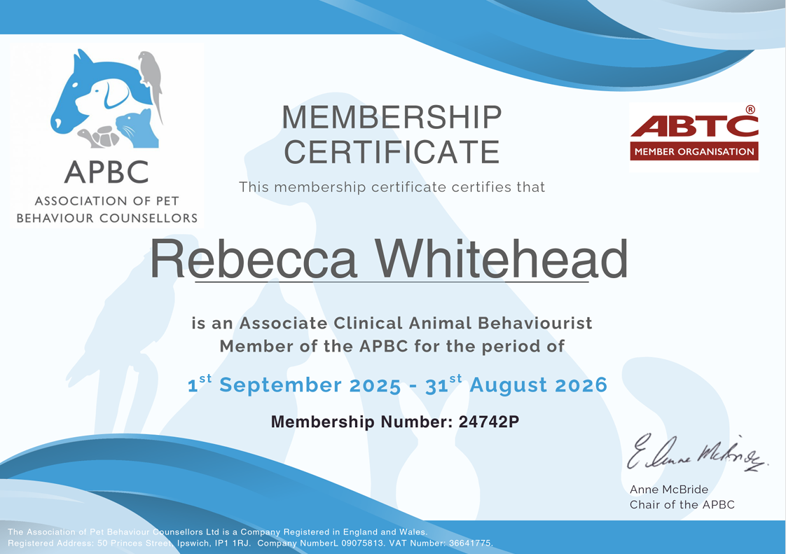 2023: Becka registered as a provisional member with the Association of Pet Behaviour Counsellors (APBC) and achieved pre-certification with CCAB Certification Ltd. This reflects that she has met the theoretical knowledge requirements, however, she is continuing to work towards full certification/membership with these organisations.