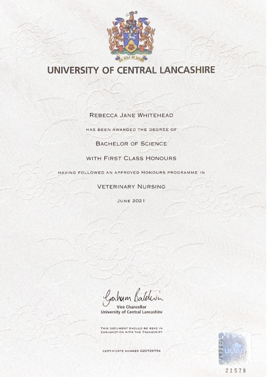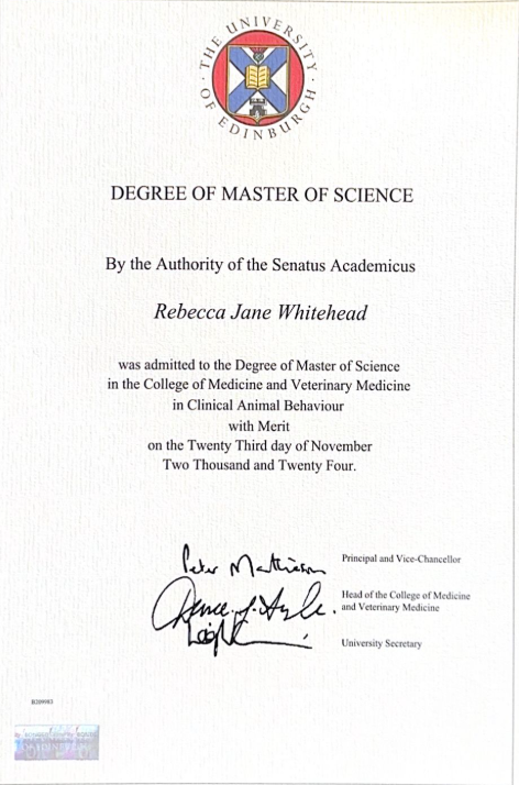 2021: Becka completed her honours degree top-up in veterinary nursing and enrolled on her masters degree in Clinical Animal Behaviour with the University of Edinburgh.