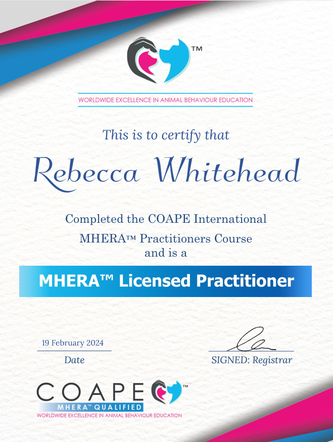 2024: Becka completed her Masters degree in Clinical Animal Behaviour, this included carrying our research and writing a 13,000 word dissertation titled ‘'Assessing the level of agreement between veterinary staff and animal behaviourists in recognising stress-related body language of brachycephalic and non-brachycephalic dogs”. Becka also certified as a MHERA licenced practitioner, completed a canine behaviour counselling mentorship programme and established Companion Conundrums in this year.